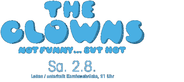 Clown-Bar: 18 - 24 Uhr Das Zirkusleben ist hart. Da rackert man sich als Clown einen ab, mit eimerweise Konfetti, aufwändiger Schminke und viel zu grossen Latschen, immer mit dem Ziel, die Kinder zum Lachen zu bringen, aber was tun die? Sie halten sich die Ohren zu und schneiden unschöne Grimassen. Eines Tages begriffen diese drei Clowns: Sie gehören nicht in ein Zelt, in dem ganze Familien auf harten Schalensitzen ausharren müssen, sondern auf schweissdichte, donner- und blitztaugliche Bühnen, vor ein Publikum, das die Gefahren der Ekstase nicht scheut. Denn wenn The Clowns ihre blues- und blutgetränkten Gitarrensongs freilassen, gibt’s weder Netz noch doppelten Boden und auch keinen Notausgang. Not funny ... but hot!